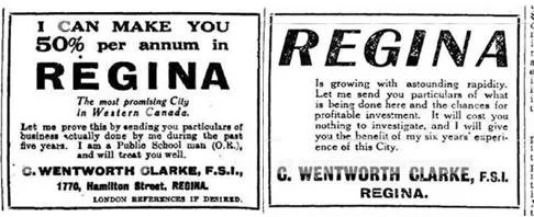 “Mr. C. Wentworth Clarke, D.L.S., Regina, has sold the north half of a section adjoining Parliament Heights for $100,000. The property has been disposed of to an English company, who propose subdividing it.”